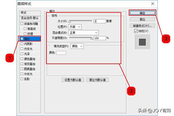 双击文字图层,或者是在“图层”面板底部选择“图层样式”图标,①选中“描边”复选框,②设置相关参数,③单击“确定”按钮。如图所示: