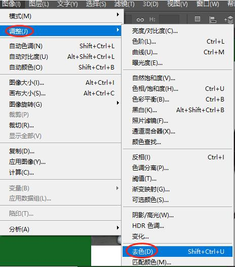 2、接着回到菜单栏点图像——调整——去色(快捷键Ctrl+Shife+u),使图像变成黑白!