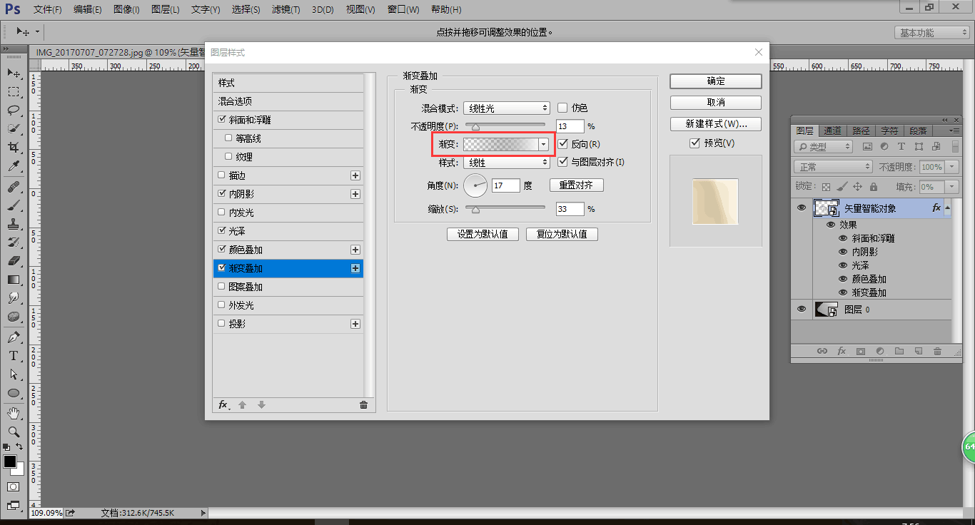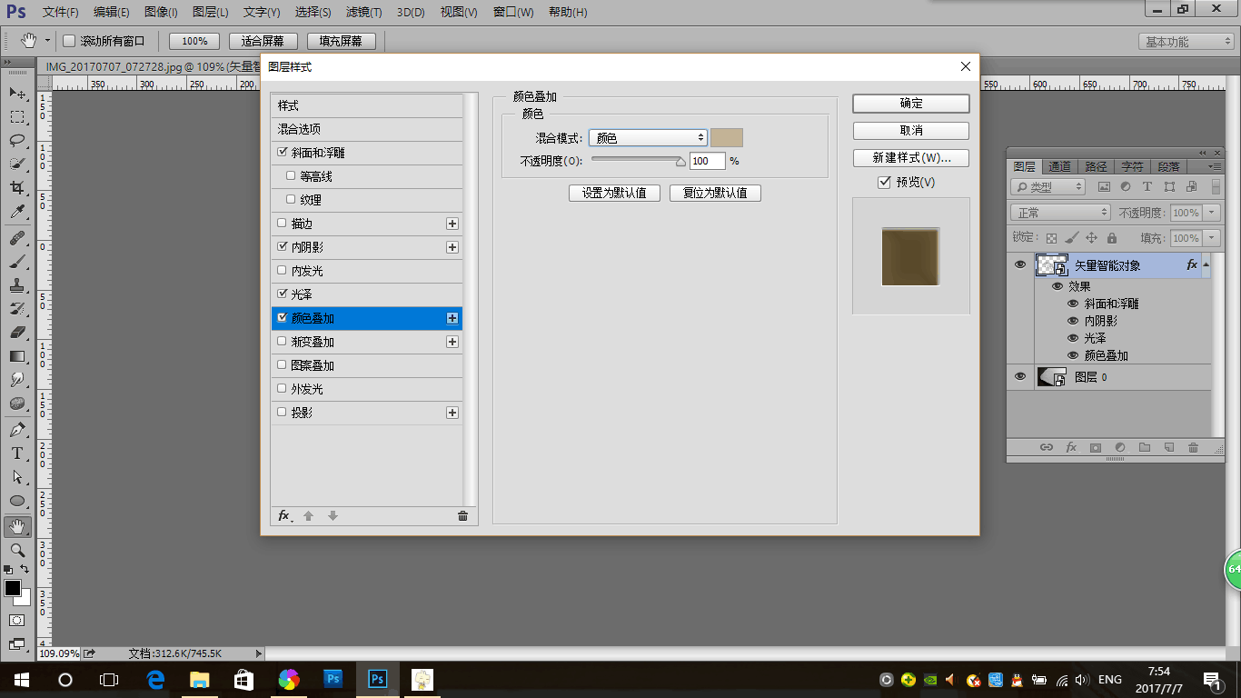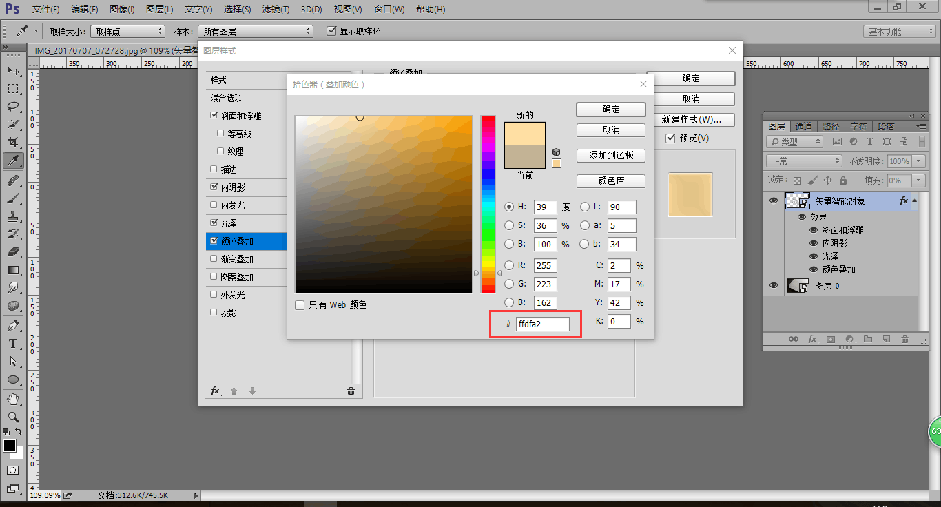 9.此时烫金效果基本完成,但是颜色不够鲜艳,这时我们把颜色叠加的图层样式里的颜色改为更鲜艳的黄色,色值为ffdfa2,点击确定,烫金效果就制作完成了