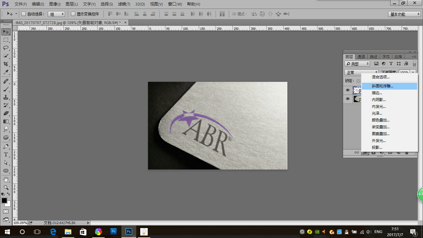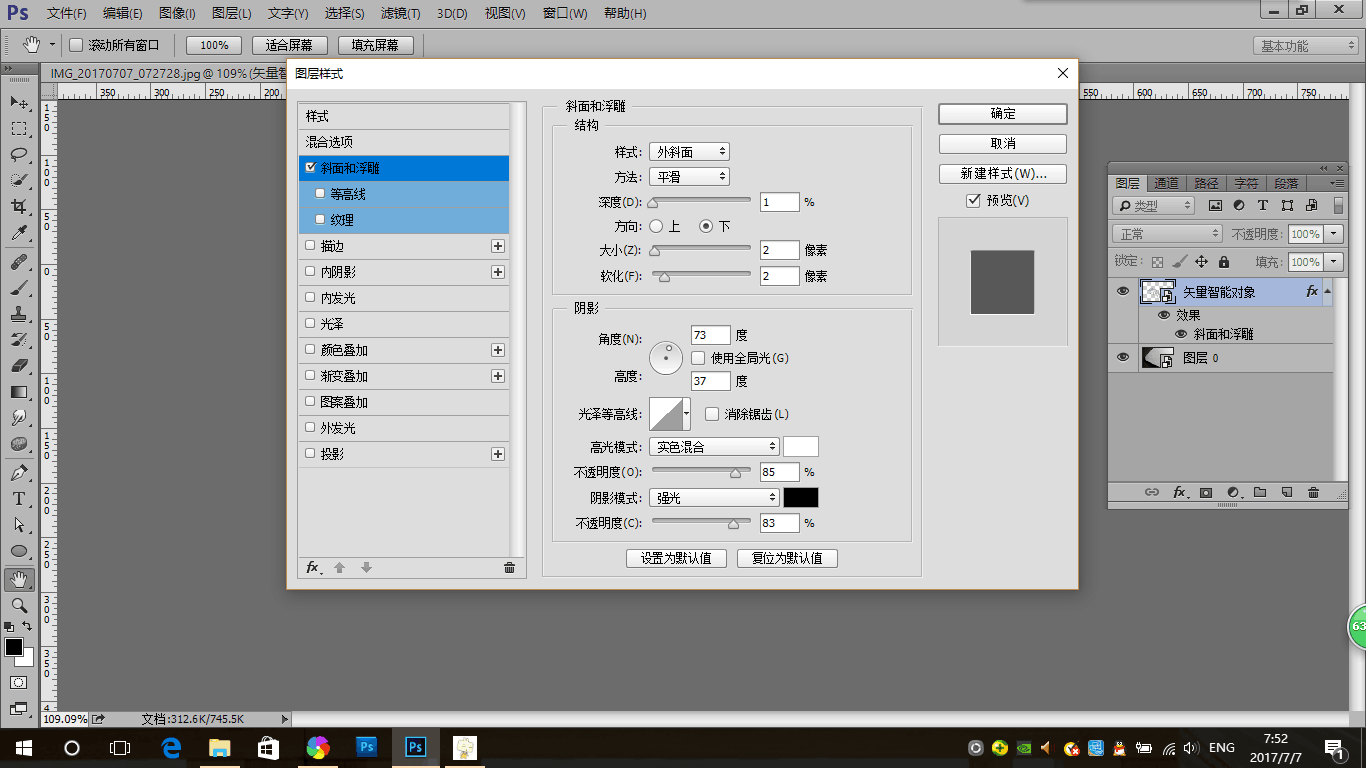 3.点击添加图层样式,调出图层样式面板,添加斜面和浮雕图层样式,参数设置如下