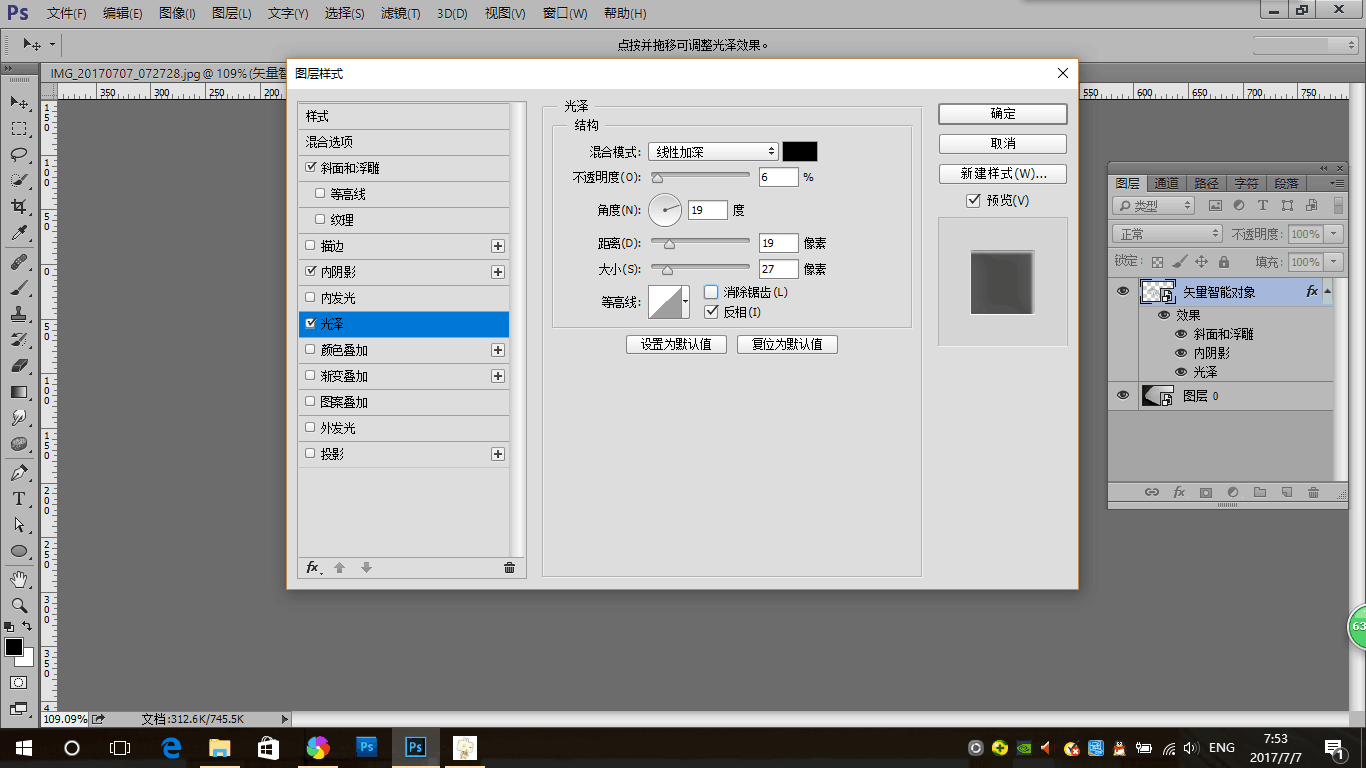 5.给logo图层添加一个光泽图层样式,模拟金属倒影反射光线的效果,光泽混合模式选择线性加深;光线角度要和斜面浮雕的角度接近,参数设置如下
