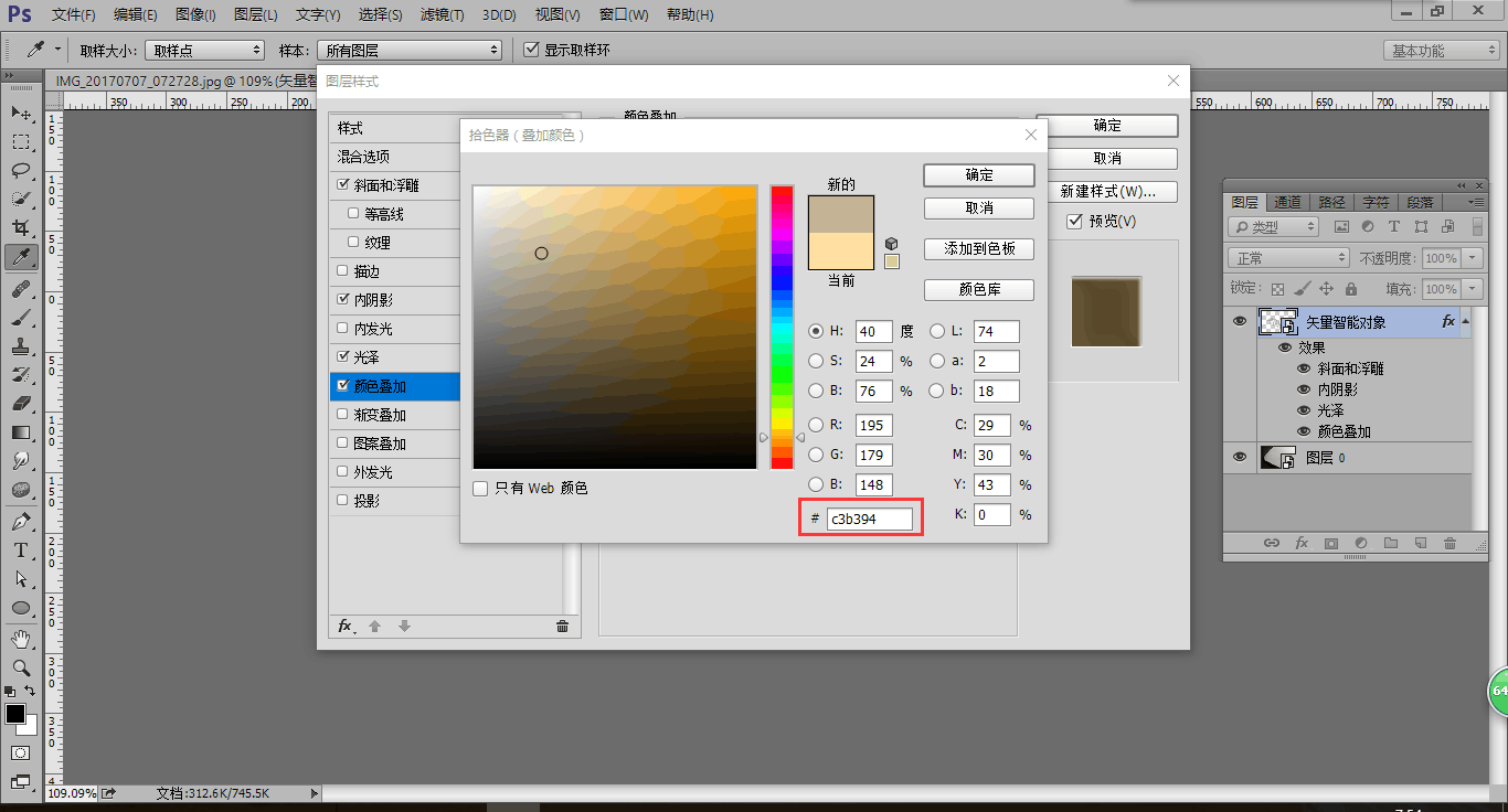 6.添加一个颜色叠加的图层样式,混合模式选择颜色,色值为C3B394的金色,不透明度选择100%,点击确定