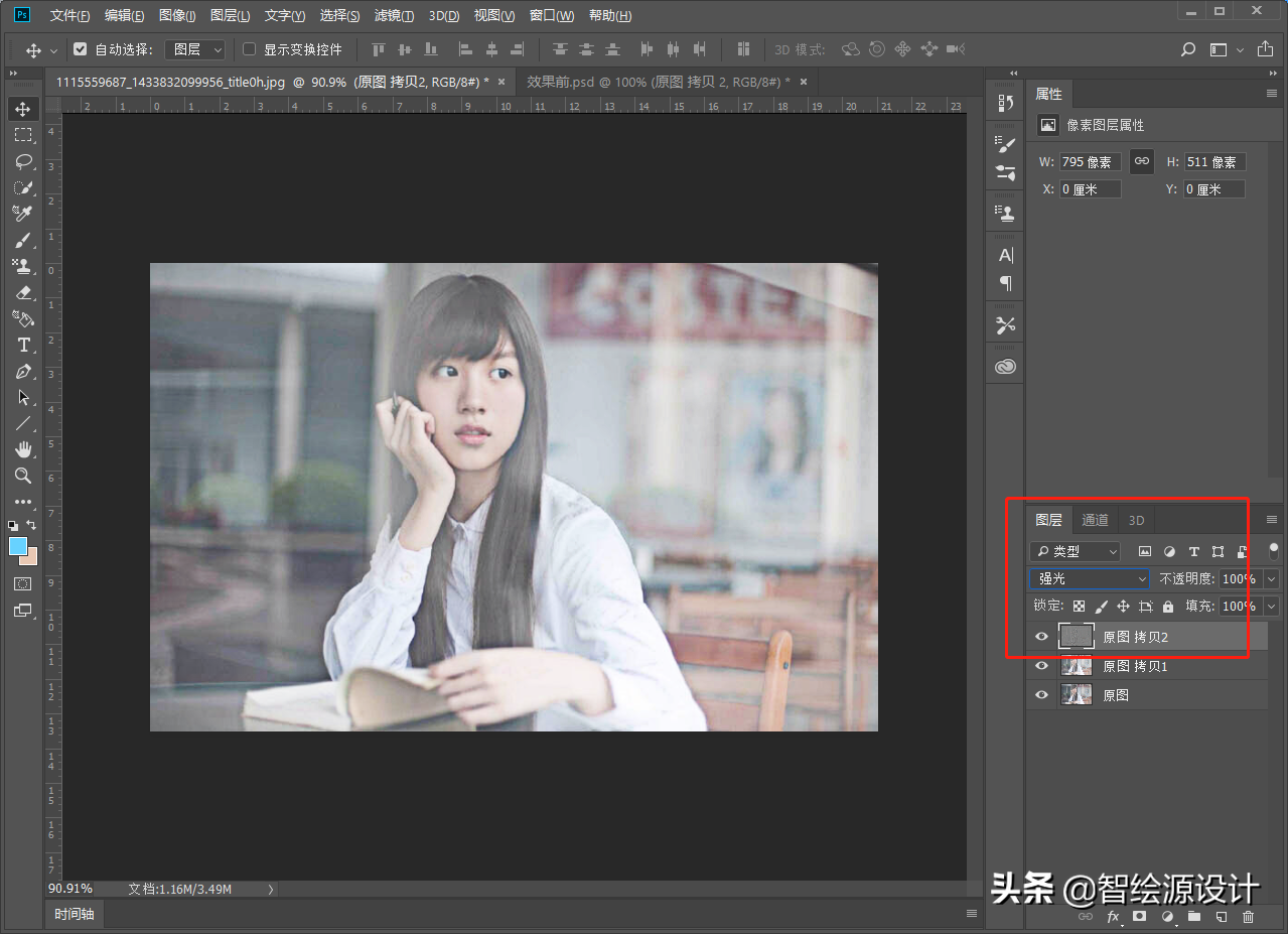 第四步:把拷贝2图层的混合模式改为强光,只显示细节