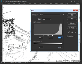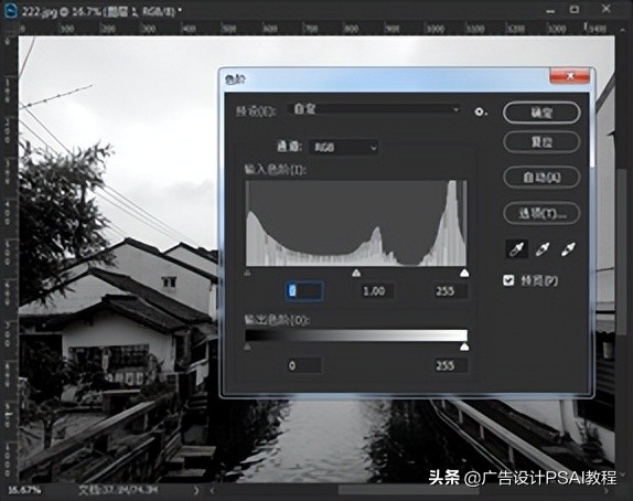 4、水墨风格效果有大量留白,增加图像的对比度等。所以执行图像—调整—色阶(快捷键Ctrl+L),增加图像对比度,如图所示。