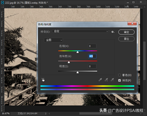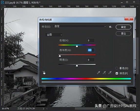 3、执行图像—调整—色相/饱和度(快捷键Ctrl+U),将图像饱和度降低(也可以通过去色或者黑白命令直接去色),如图所示。