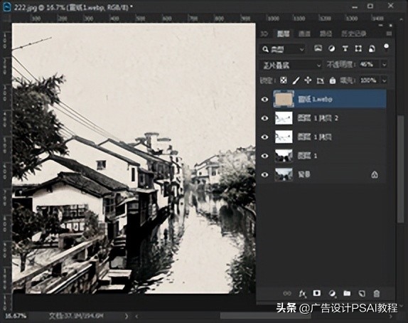 12、导入一张宣纸素材,将图层混合模式设置为正片叠底,由于颜色过于强烈,执行图像—调整—色相/饱和度,降低图像饱和度,如图所示。