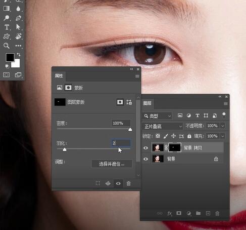 9我们再次点击图层蒙版,再点击菜单栏的窗口——属性,将羽化像素设置为2像素,然后我们把这个图层再复制一份,这样眼线就显得更加深邃了。