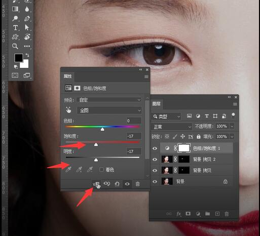 10然后我们再新建一个色相饱和度的调整图层,把它的饱和度稍稍的降低一点,把它的明度给降低一点点,然后把它剪接到下方去,