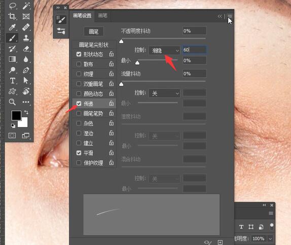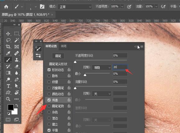 第5步:再次修改画笔预设,将渐隐数值调低到20,绘制下方睫毛。