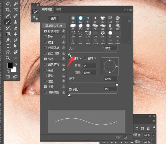 第2步:然后选择画笔工具,点击画笔预设,首先将画笔大小设置为1,
