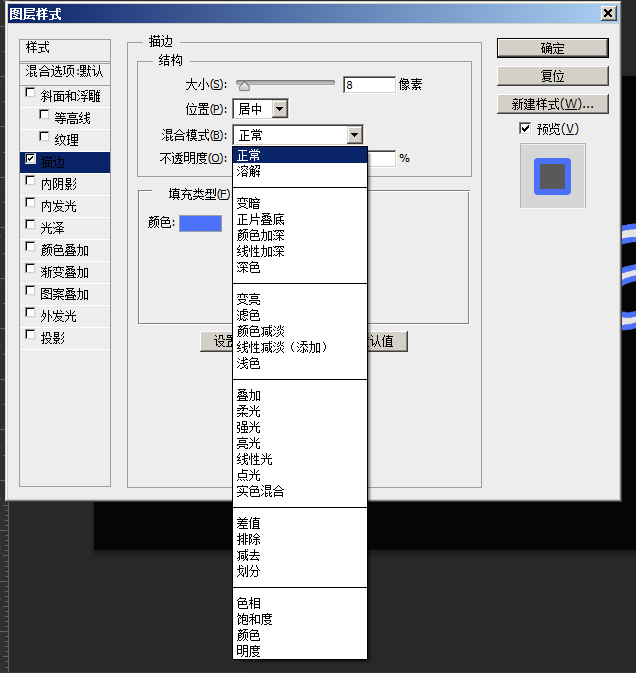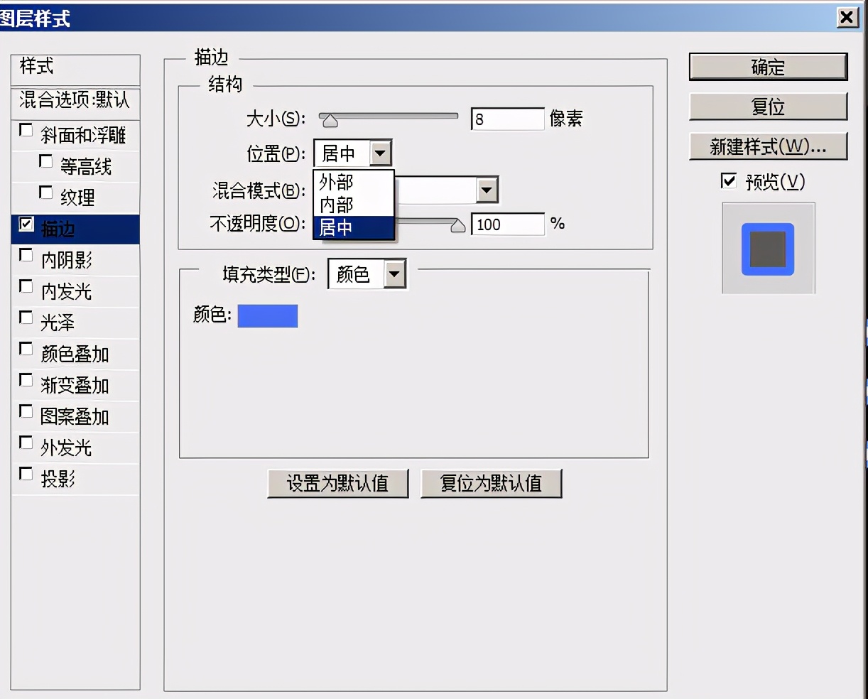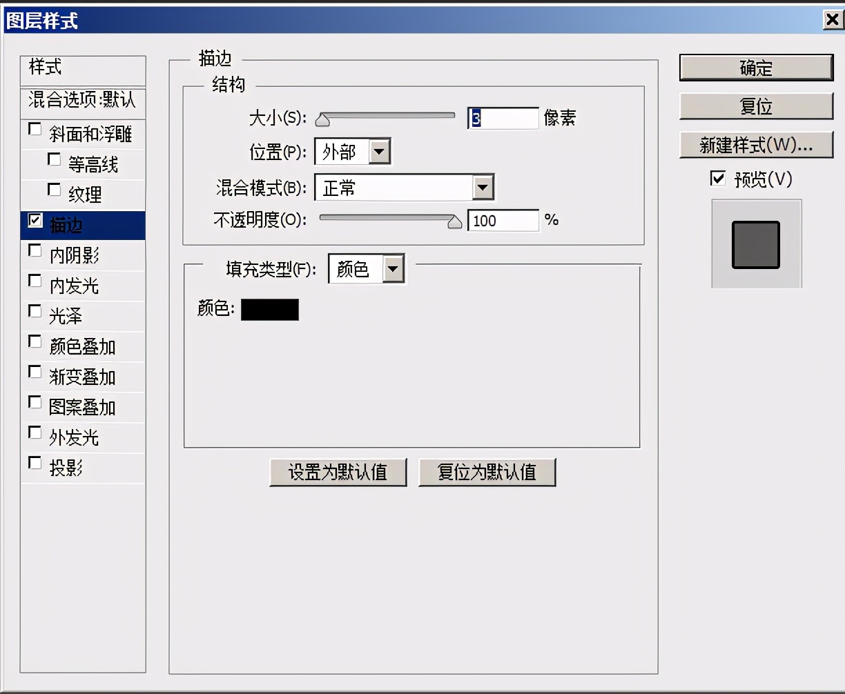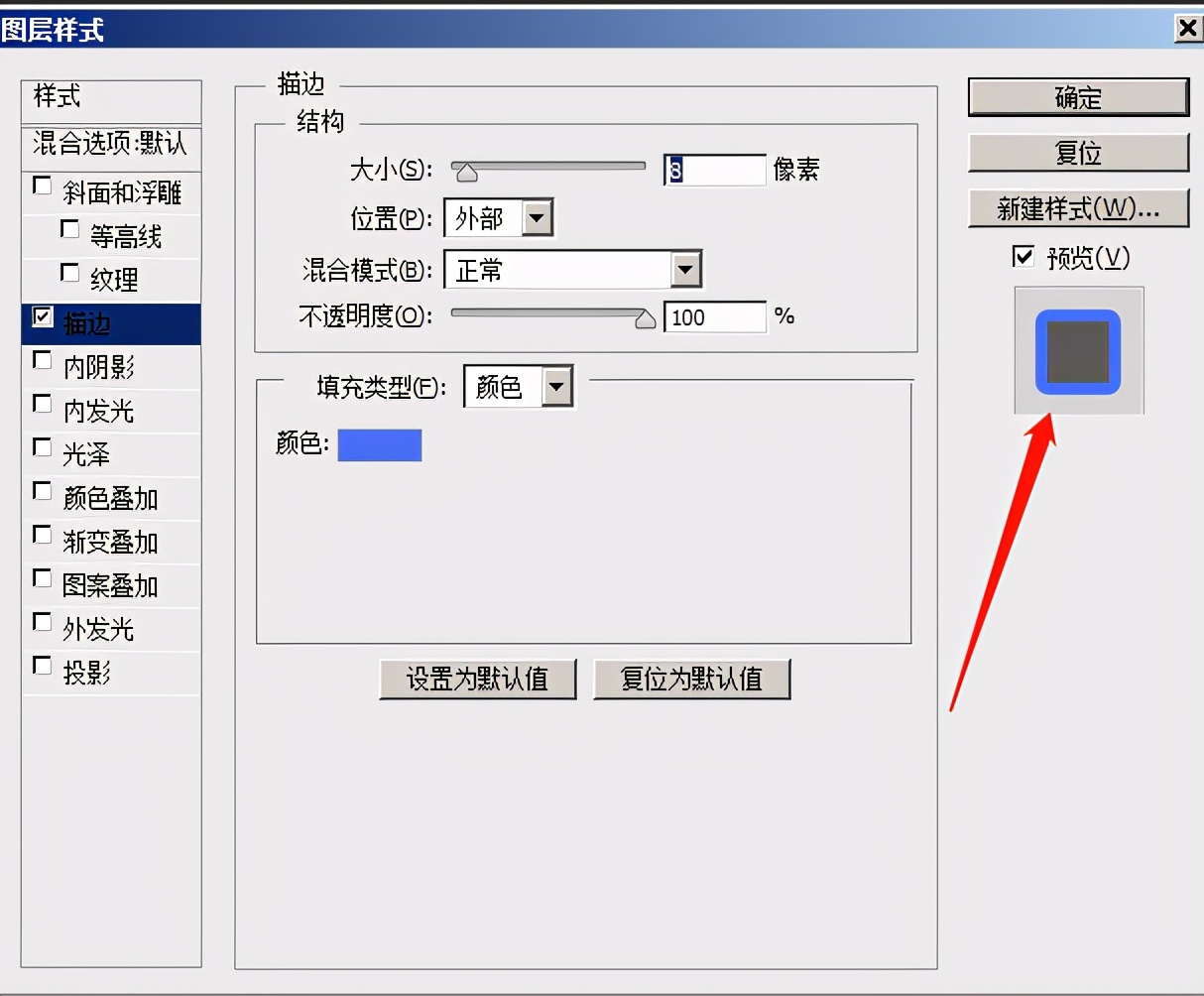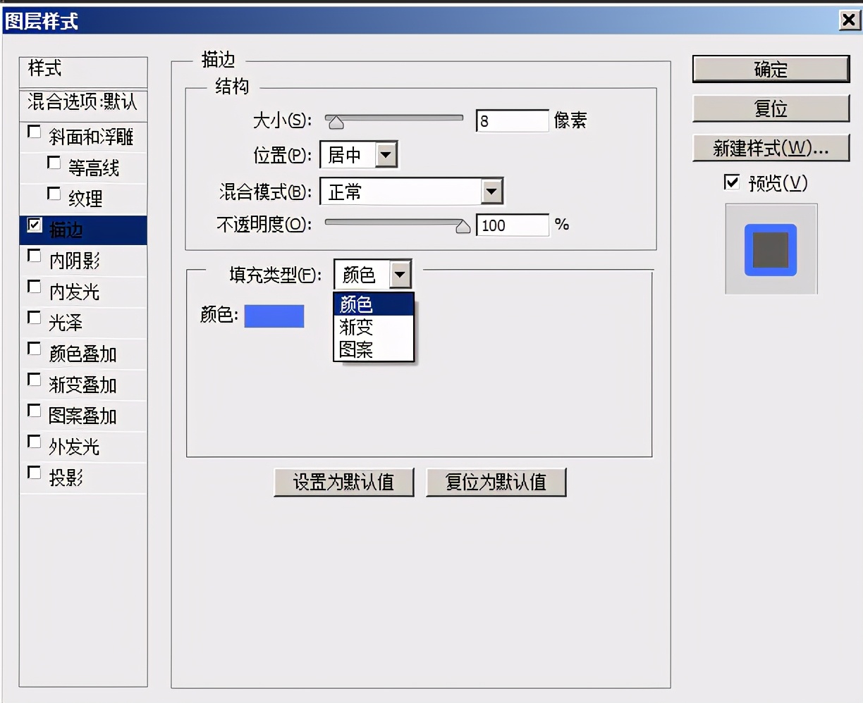 点击一下图层样式,选择描边,描边里面有结构和颜色两个部分,
