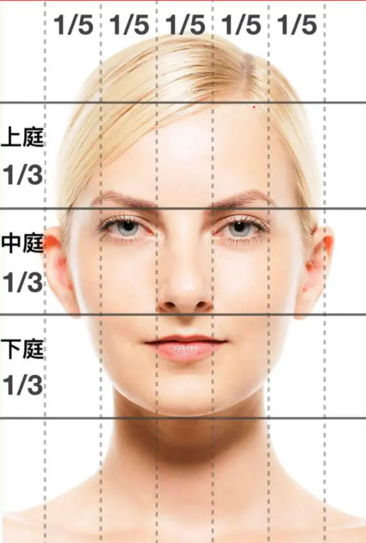 首先跟大家聊一下三庭五眼。三庭五眼是人的脸型的一般标准比例。把头部上下分为三等分。把头的宽度分为五等分。