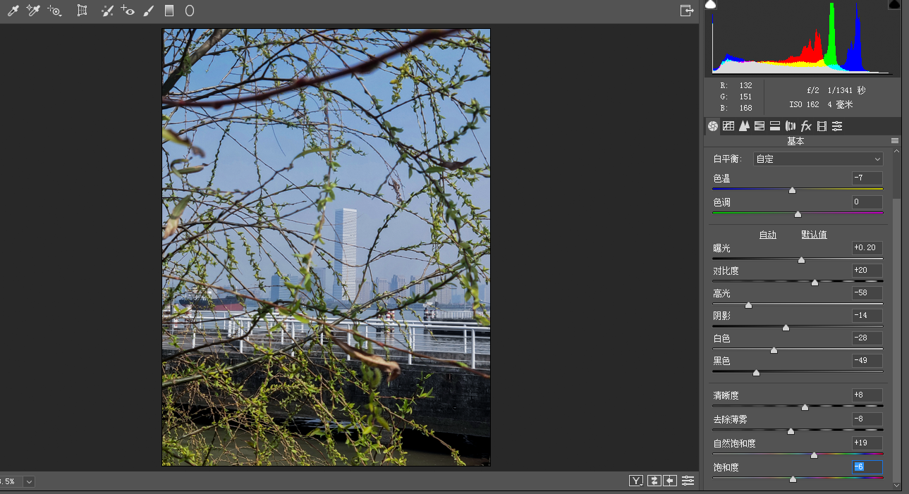 这张图是周末到黄浦江的前滩公园溜达随手拍摄的一张图片(有没有小伙伴认识的,哈哈)。首先当然是进Camera raw滤镜,这里不在多说,基本上很简单就可以调出如下的结果。