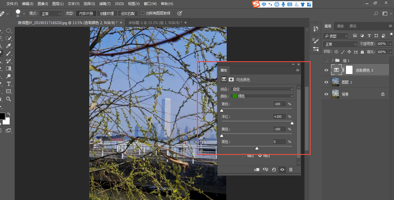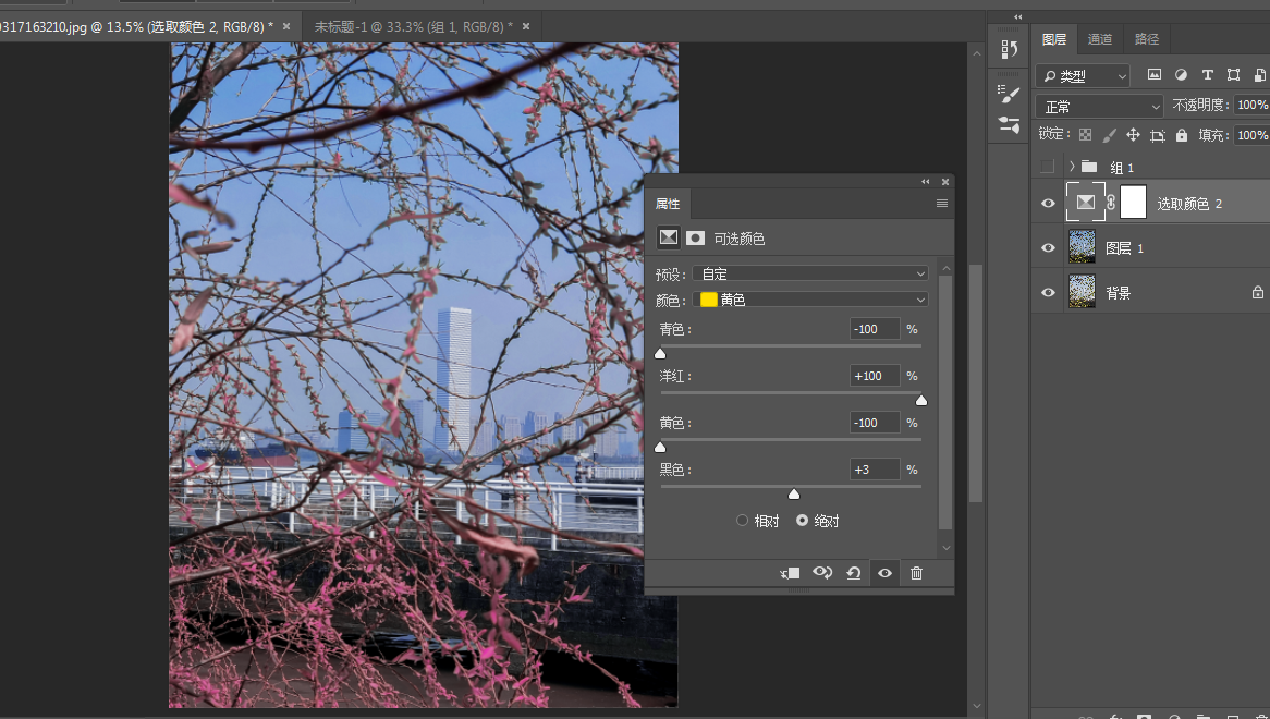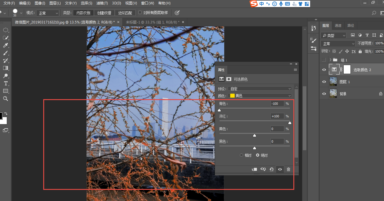 但是当我们做完这一步后发现颜色并没有向我们希望的那样,那是因为树叶中有很多黄色在,我们必须把黄色的颜色也向红色偏,如何做?相信小伙伴们已经知道了,黄色和品红是红色的组成部分,那么我们就在黄色中加洋红色,减青色。