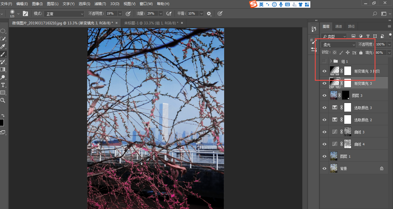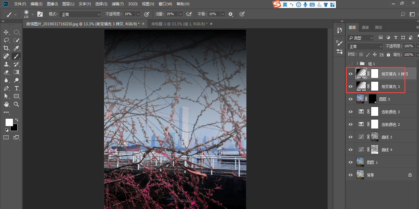 这样就不会显难看了,接着我们为了突出那个大楼,所以要对整个画面的上部和下部压暗,方法很简单,采用渐变图层,