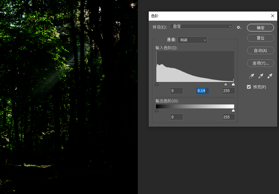 Ctrl+L色阶调节,把灰场滑块往右边调(大概0.14左右)点击确定,见1-2图;
