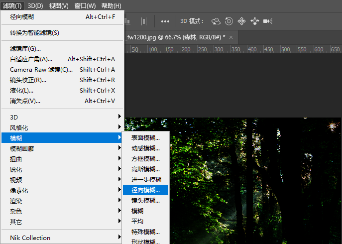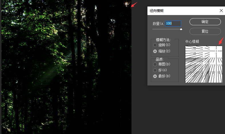 径向模糊数量调至100,模糊方法:缩放,品质:最好;中心模糊以图片的太阳位置来调中心点(如素材太阳光在右上角位置,所以中心模糊位置也调至右上角),见1-4图;