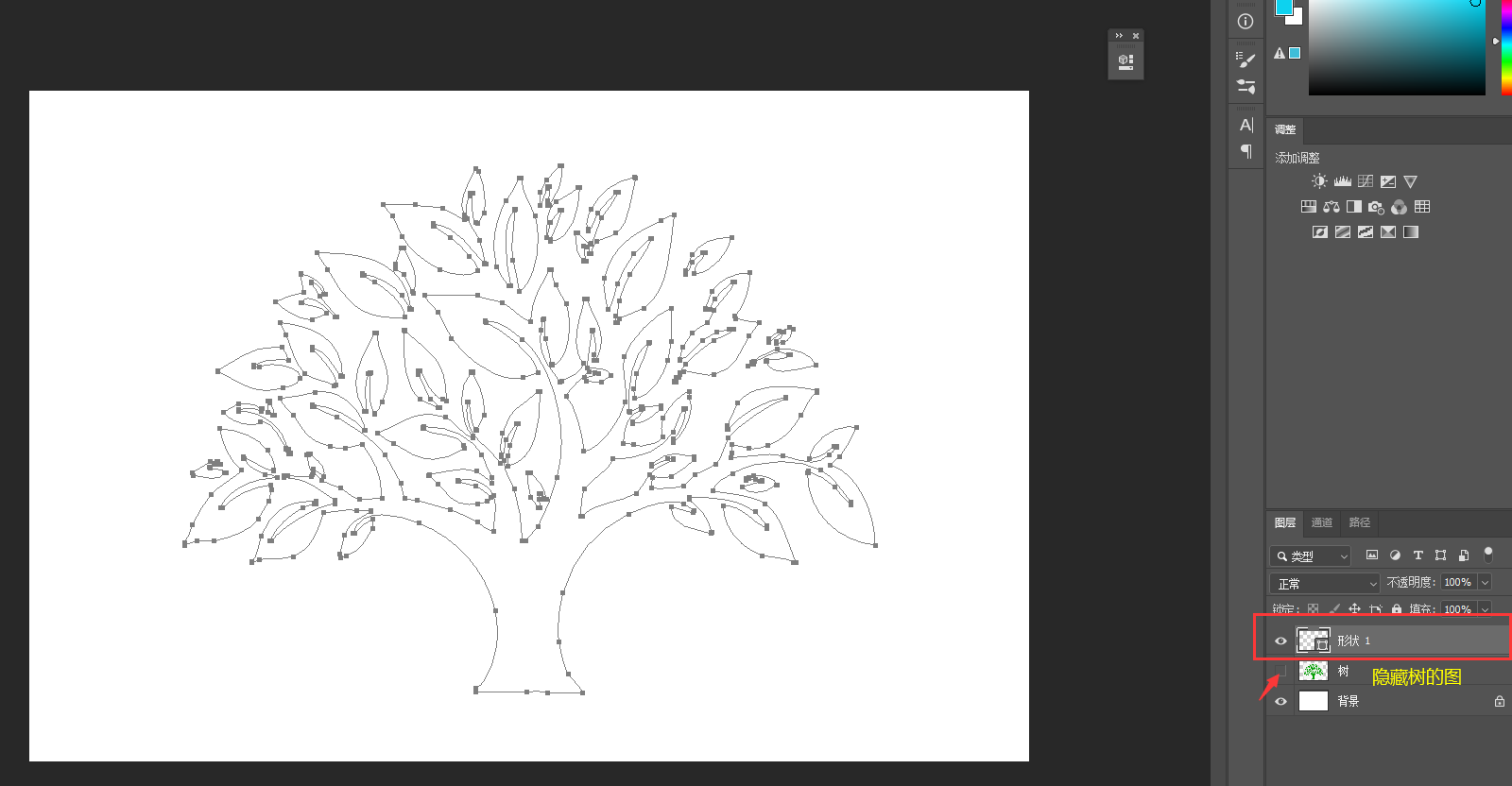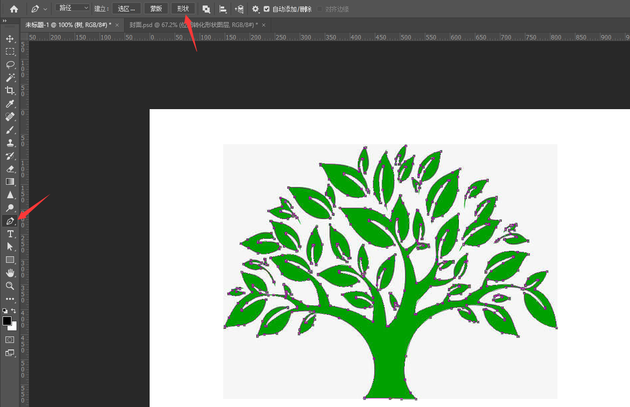 3、选择“钢笔”工具,在属性栏处选择“形状”,图层面板会多出“形状1图层”(见3-2图),把树的图层隐藏即可;