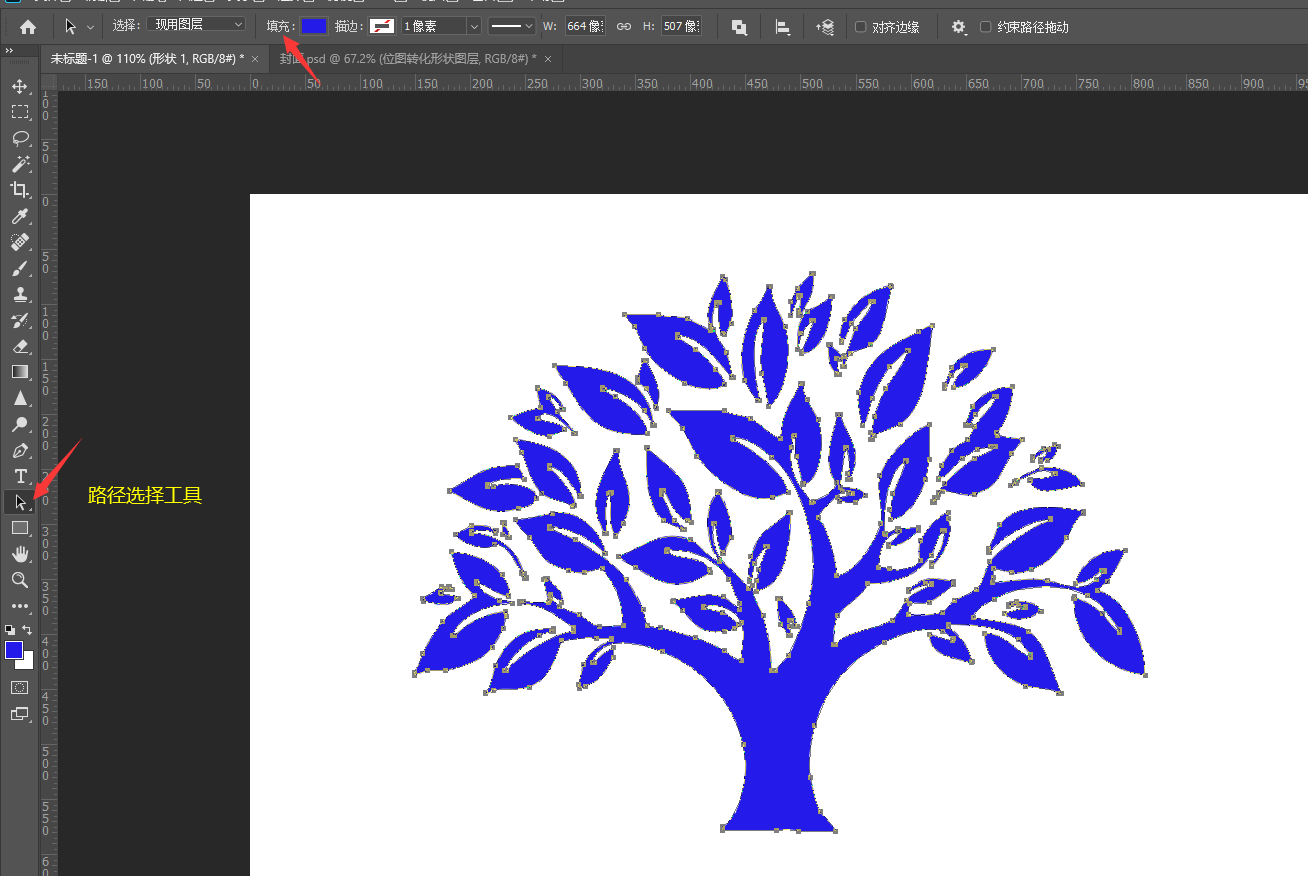4、选择“路径选择工具”,找到属性栏把填充颜色改掉,就可以看到树的改变了;