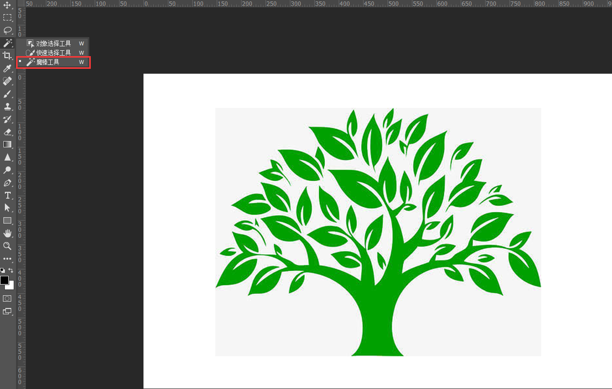 1、在工具栏,选择魔棒工具(见1-1图),对着“绿色的树”点下去(见1-2图);