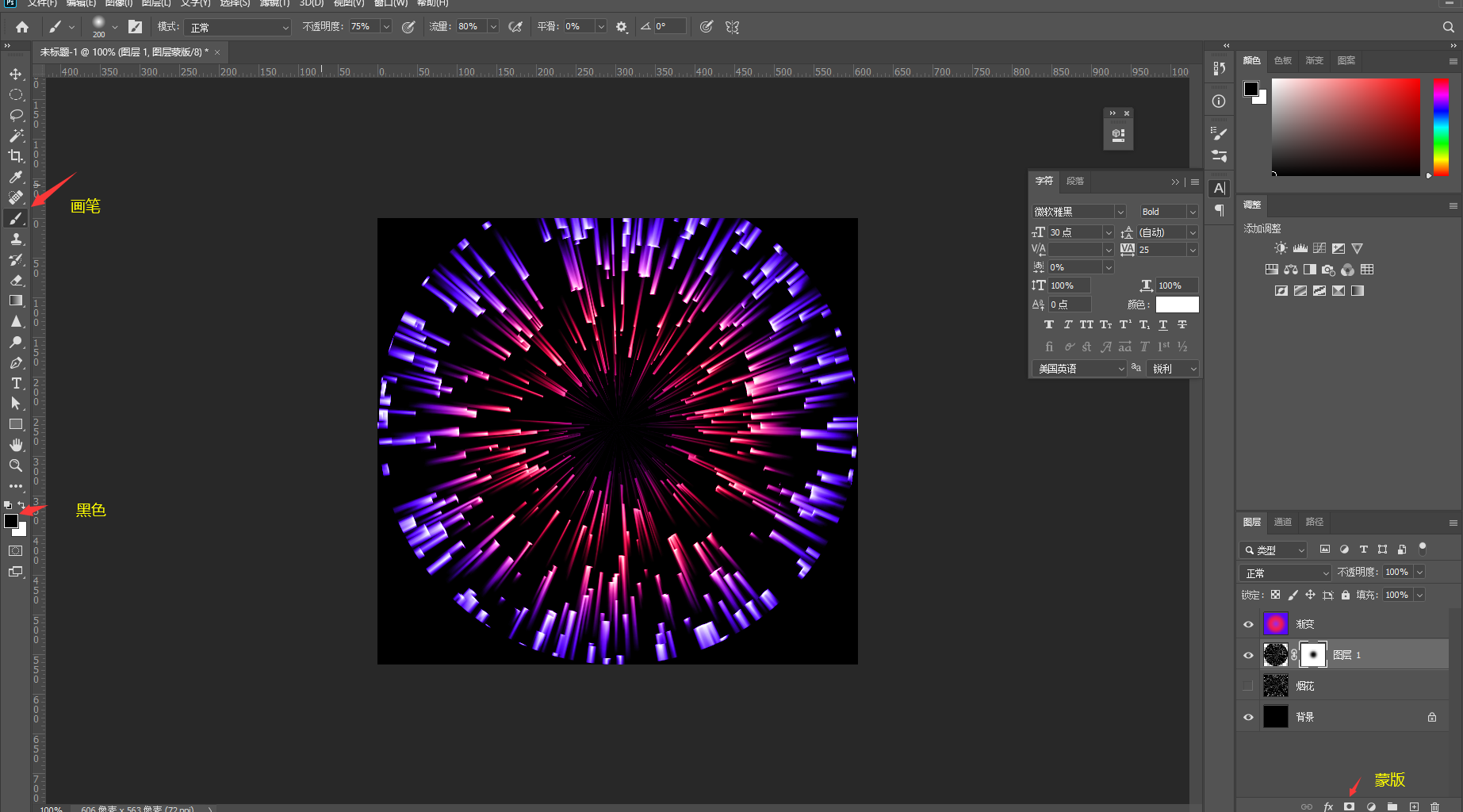 给“烟花”图层添加蒙版,使用黑色“画笔”工具,在烟花最中心点几下消失就可以了,见7-7图
