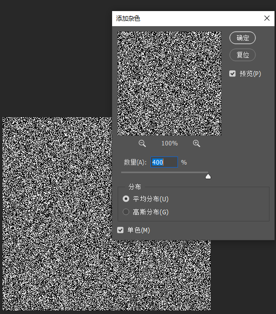 2、滤镜——杂色——添加杂色,见2-1图;数量为:400,见2-2图;