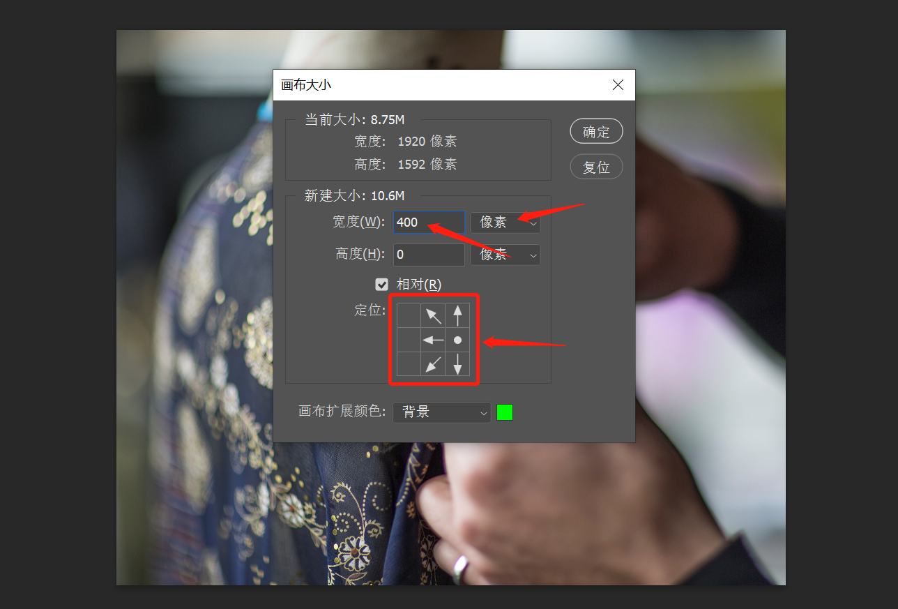 这时,你可以输入希望画布增加的像素数量,假设现在给画布宽度增加400像素,那么就直接在宽度输入框输入400,增加高度同理,现在我保持高度不变,点击右上角【确定】。