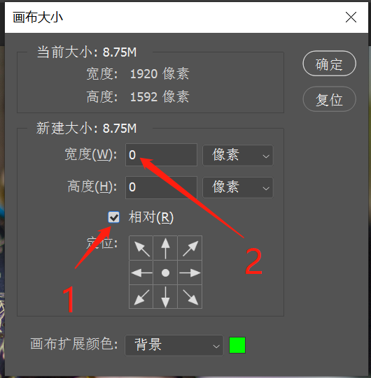 勾选【相对】复选框,你会看到【新建大小】的宽度和高度输入框中的数字已经被PS自动设置为0。