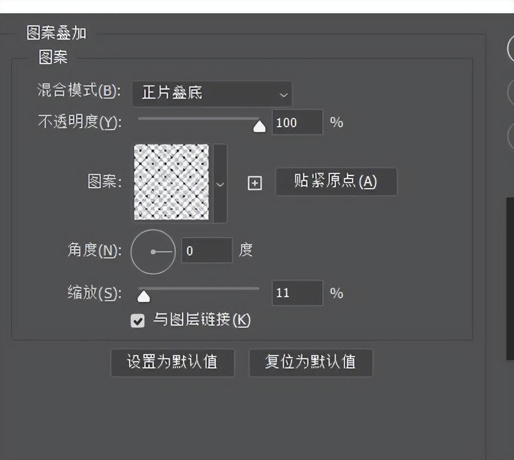 4、添加图案,图层底部面板添加样式按钮fx,选择图案叠加,相关参数设置如下图