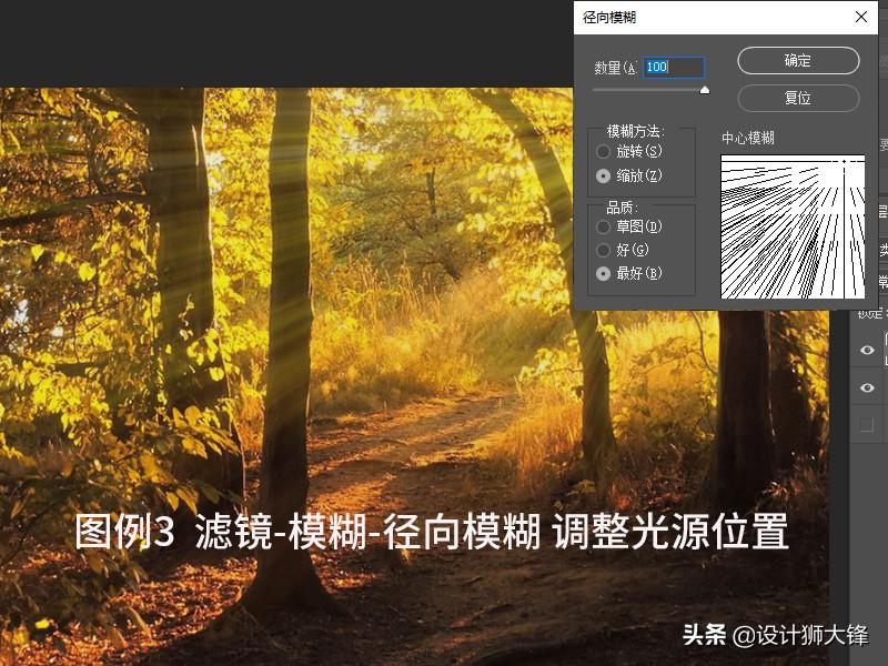 2.滤镜-模糊-径向模糊,数值调为最大,模糊方法为缩放,品质调为最好,并且根据图片的实际要求情况,调整光源的位置。