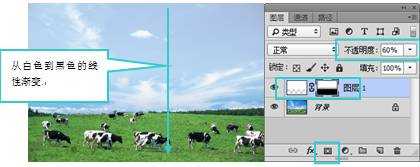3. 单击“添加图层蒙版”按钮,为图层添加一个空白蒙版,使用(渐变工具)在蒙版中从上向下拖动填充一个从白色到黑色的线性渐变,在设置“不透明度”为60%,如图3所示。