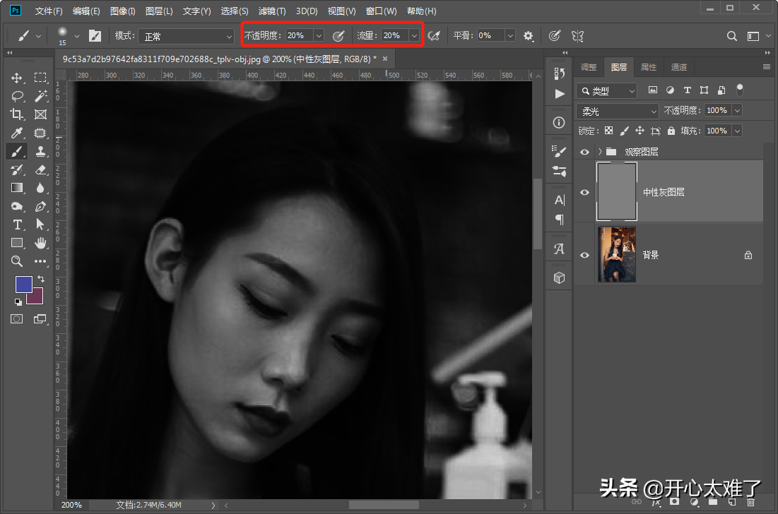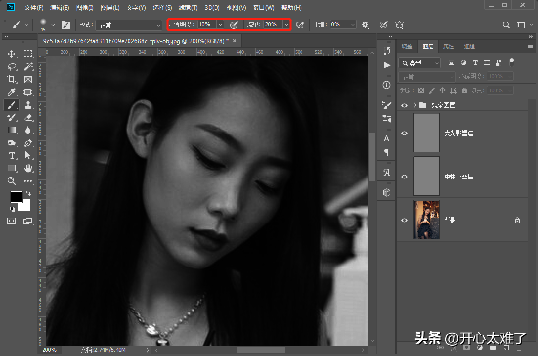 新建一个中性灰图层,还是使用画笔工具,不透明度设置为10%,流量20%。适当放大画笔的笔触,对人物面部进行光影进行调整,或者对过渡不自然的区域进行调整。和化妆一样,少量多次。利用化妆的原理,调整人物面部的明暗关系,达到美化的效果。