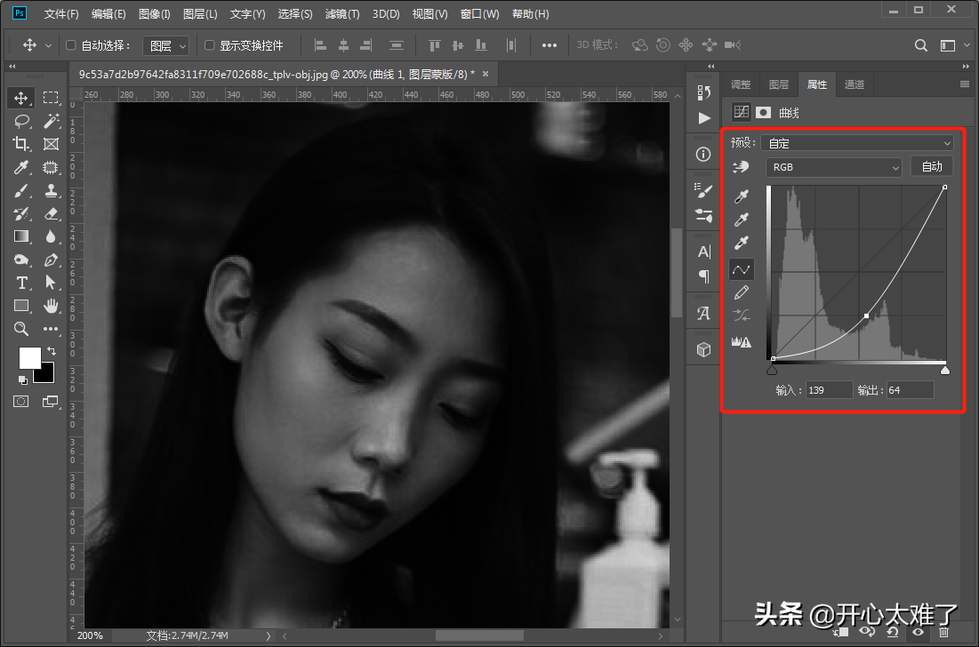 利用曲线压暗图像,增强对比度,直到人物皮肤黑白分明即可。后面对人物皮肤进行光影塑造的时候可以随时调整曲线,方便观察效果。