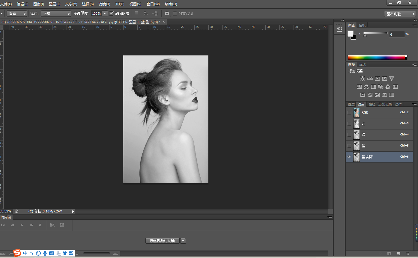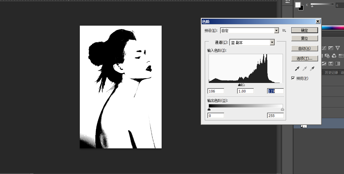 3、为了更好的进行区分头发和皮肤,我们使用ctrl l,色阶,使黑的更黑,白的更白,