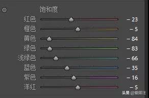 什么色调看起来比较舒服呢?当然是简单干净的色调啦,HSL这里大家可以比较直观的看到你调每一步的变化,从而更加明确要定的调。这组照片中,我把绿色黄色的饱和度降的比较狠,就是为了去掉一些不想要的色调干扰,让白色更加干净。