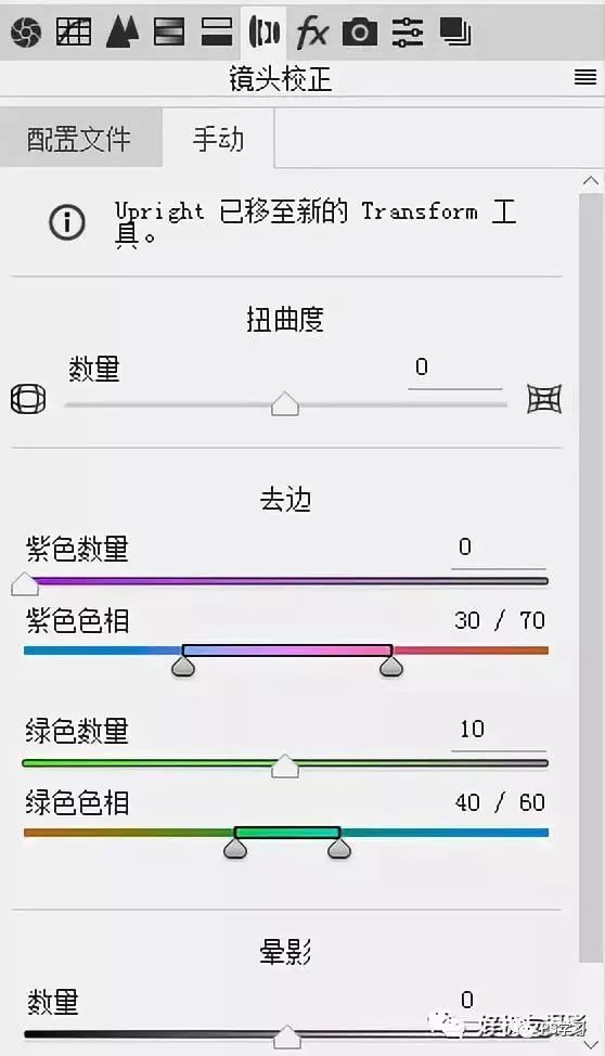 11.在“镜头校正”选项卡中选择“手动”子选项卡,并拖动“去边”区域中的“绿色数量”滑块,直至得到满意的效果为止。下图所示为去边前后的局部效果对比。