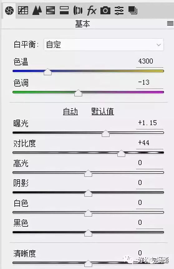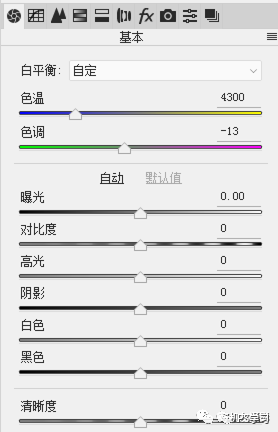 3.选择“基本”选项卡,在右侧参数区的顶部适当调整“色温”与“色调”参数,,以初步确定照片整体的色调。