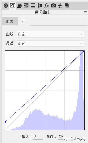 7.选择“色调曲线”选项卡中的“点”子选项卡,然后在“通道”下拉列表中选择“蓝”选项,在调节线上按住鼠标左键拖动,以添加节点以增强照片中的蓝色。