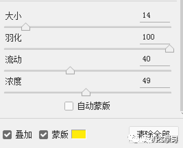 8.选择调整画笔工具并在右侧设置的画笔大小等参数。使用调整画笔工具在人物身上涂抹,以确定调整的范围(为便于观看,笔者在右侧选中了“蒙版”选项,以显示调整的范围)。