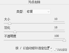 12.选择污点去除工具并在右侧设置适当的画笔参数。然后将光标置于斑点上,并保证当前的画笔大小能够完全覆盖目标斑点,单击鼠标左键,即可自动根据当前斑点周围的图像进行智能修除处理,其中红色圆圈表示被修除的目标图像,绿色圆圈表示源图像。