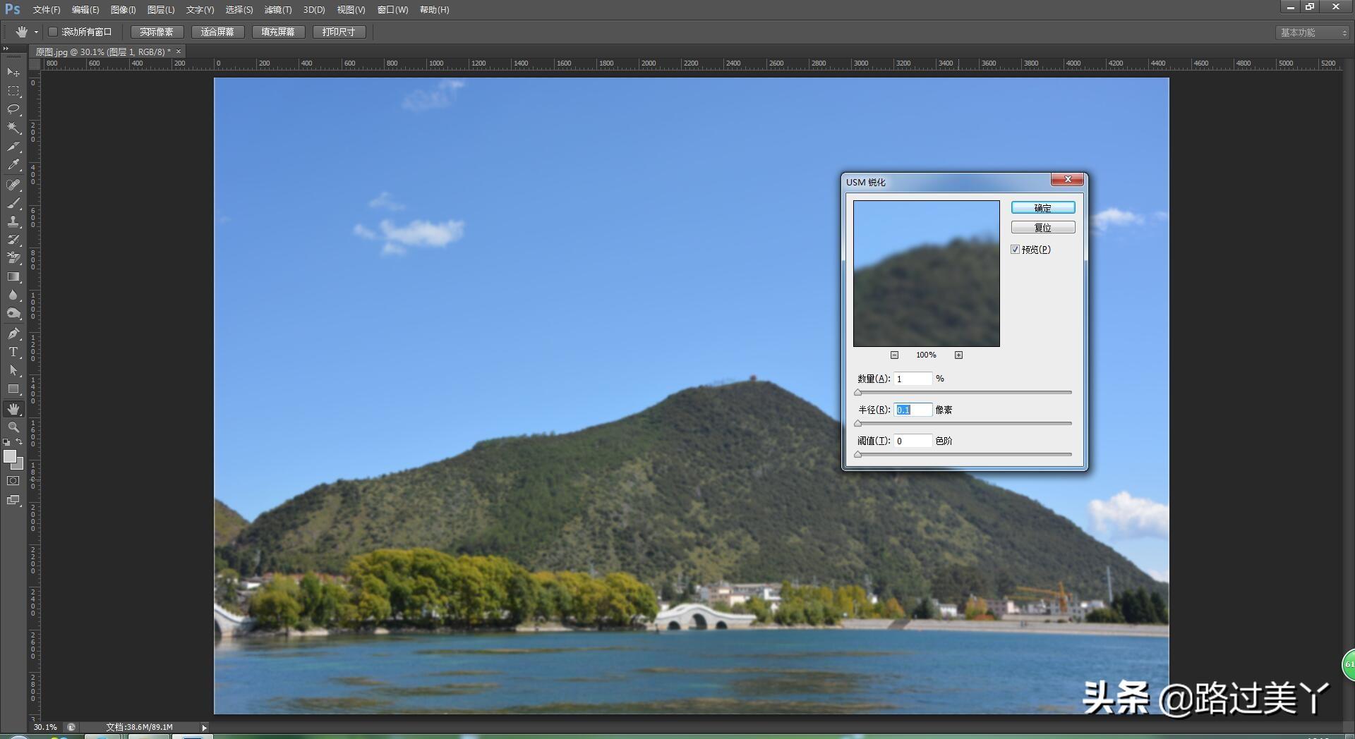 2、菜单栏—滤镜—锐化:USM锐化,设置锐化参数。