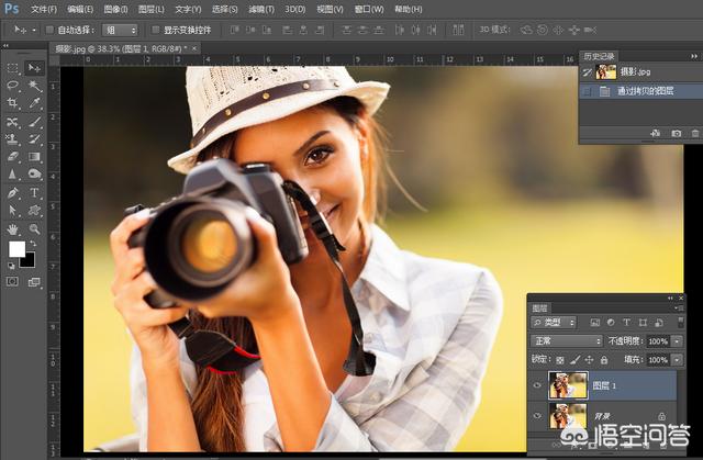 在PS中打开图片,快捷键ctrl O,然后按Ctrl J组合键,复制“背景”图层,得到“图层1”如下图所示。