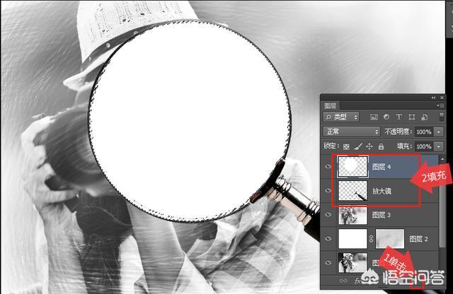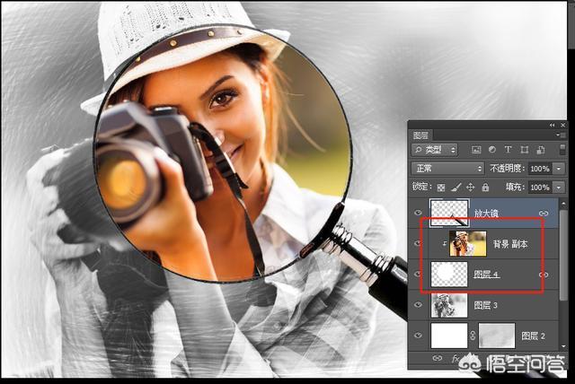 按住Alt键的同时在“图层4”和“背景副本”两个图层中间单击鼠标左键,创建剪切蒙版,放大镜外面显示的是素描画,入下图所示