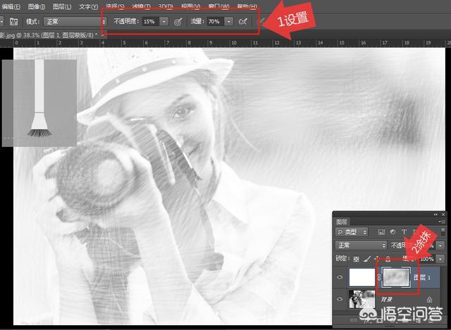 在“画笔”工具属性栏中设置“不透明度”为15%,“流量”为70%,对蒙版进行编辑操作,绘制倾斜的线条,直到人像越来越清晰,如下图所示。