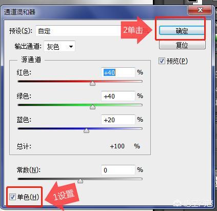 单击“图像”-“调整”-“通道混合器”命令,在弹出的对护框中选中“单色”复选框,单击“确定”按钮,如下图所示。
