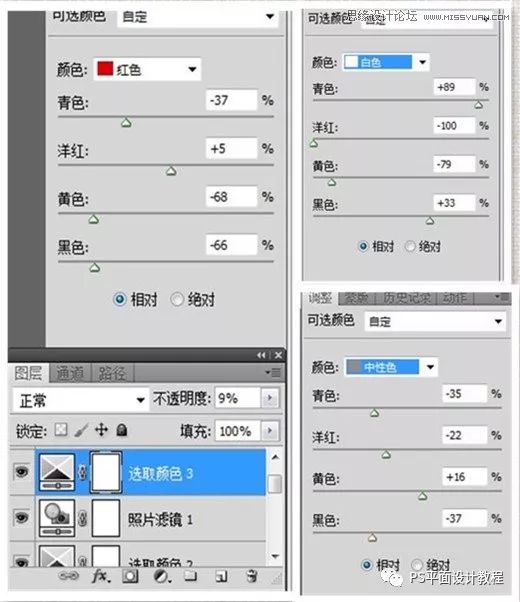 新建调整层——可选颜色,图层不透明度9%,数值如下: