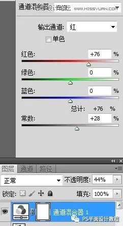 新建调整层——通道混合器(红:76 0 0 常数:28),图层不透明度44%