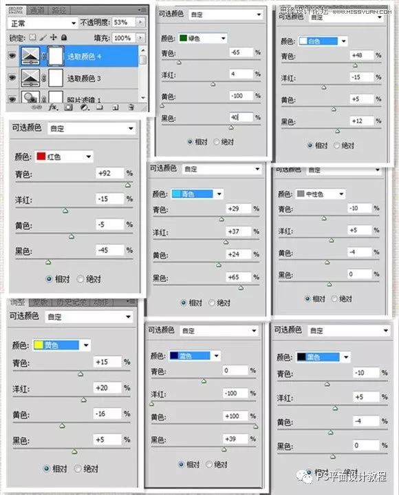 再次创建调整层——可选颜色,图层不透明度53%,数值如下: