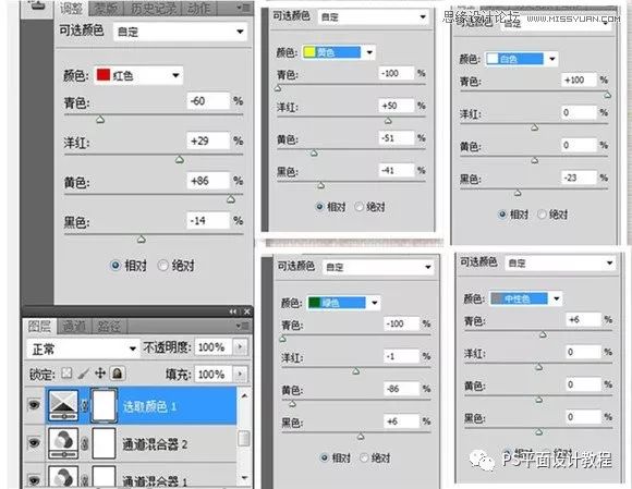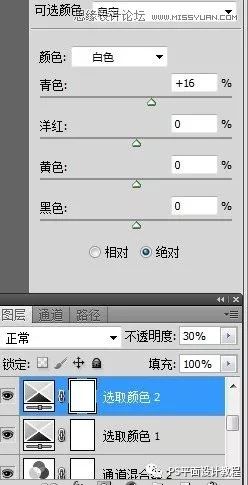 再次新建图层——可选颜色,图层不透明度30%,数值如下:
