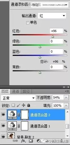 再次新建调整层——通道混合器(红:96 0 0 常数:0),图层不透明度 54%